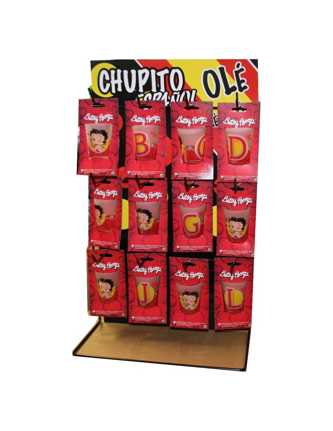Verre Betty Boop initiales, lettres de A à Z .   assorties . prix unitaire : 1.3 HT. Dimensions : ht 6 cm x Ø 4.50 cm